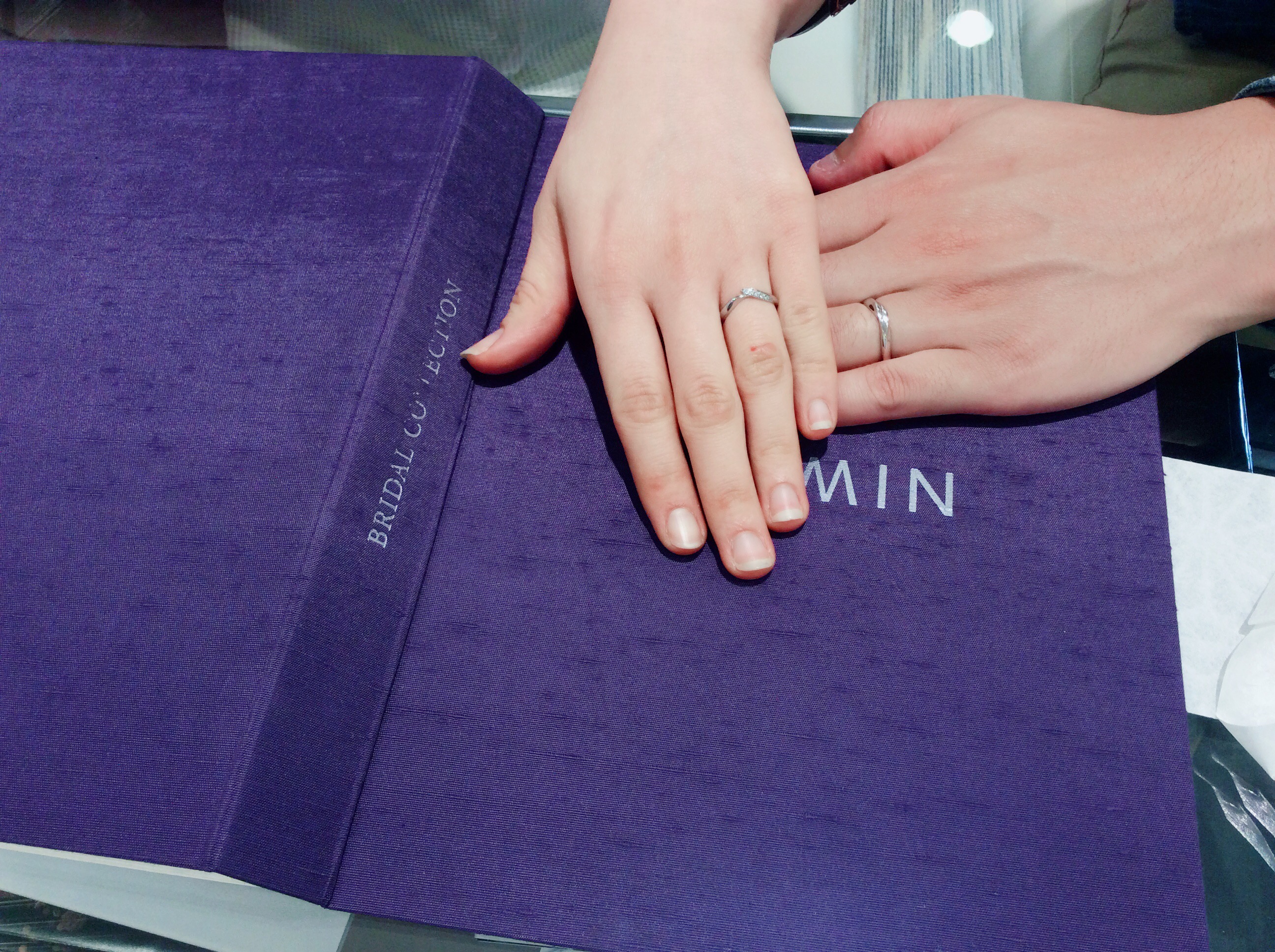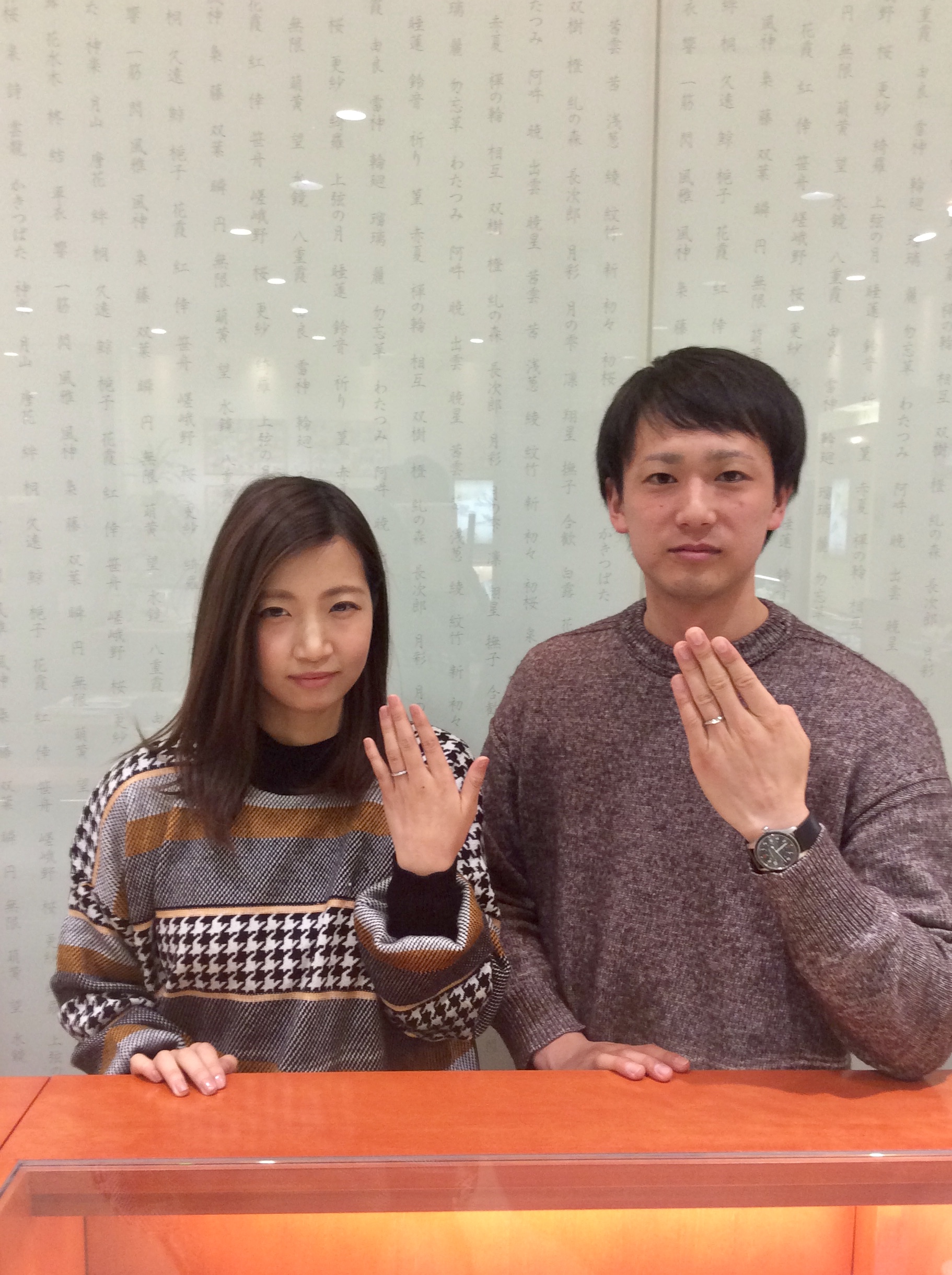 『 公明様、奈津実様。ご結婚おめでとうございます。何店か色々な指輪を見て、思い描いていたリングに出逢えなかったお二人。帰りに当店にお立ち寄りいただき、俄をご試着いただいた時の嬉しそうなお顔は忘れられません。楽しそうに迷われ選ばれた指輪はとてもお似合いでした。お互いを察し合いながら選ばれる姿は、とても印象深く、こちらまで嬉しくなりました。これからも末永くお幸せに♡♡♡又、お店にもぜひお立ち寄りください。』