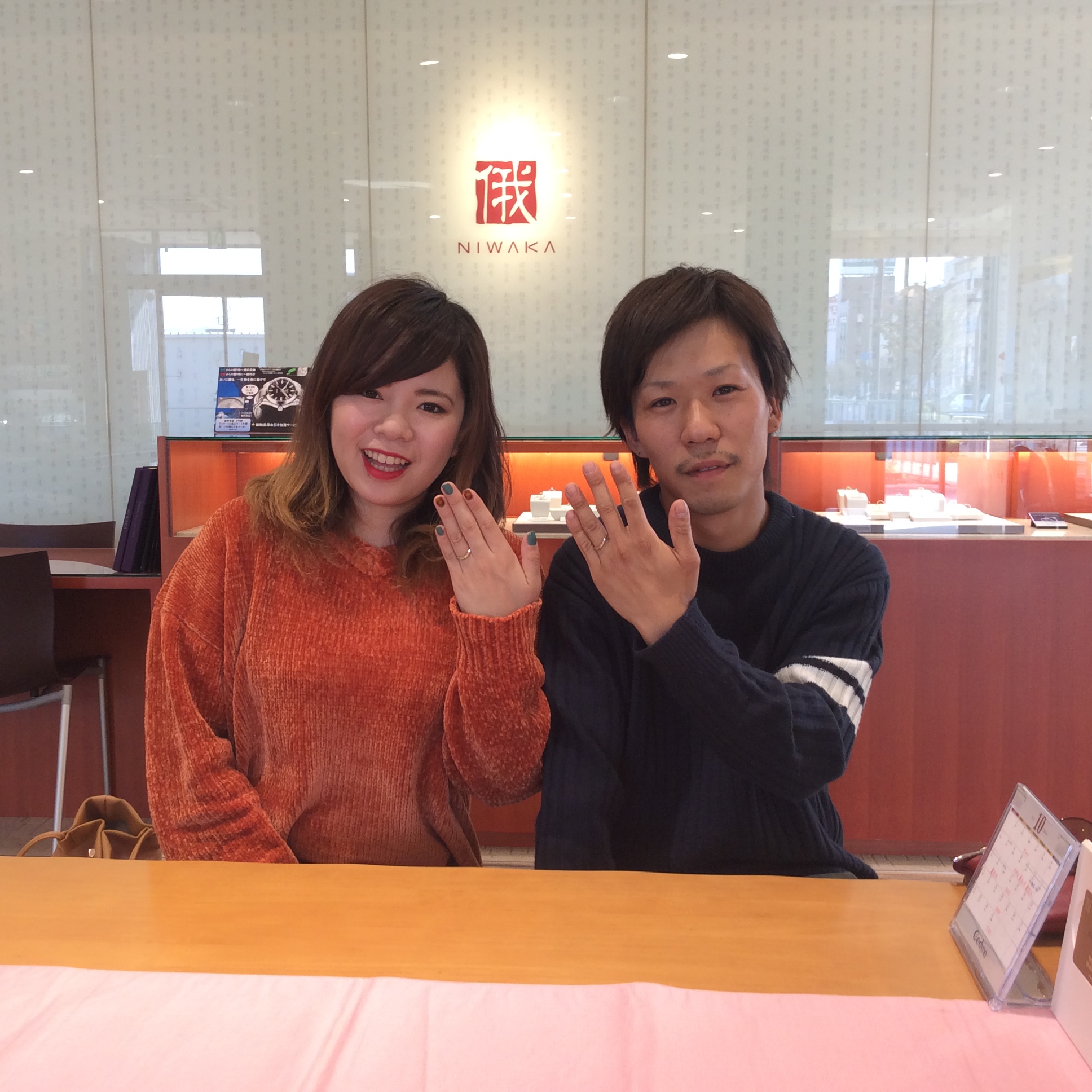 『 NIWAKAの指輪をご検討にご来店いただいたお二人。とても仲良くご相談しながらご検討なさるお姿は、こちらまで心温まる感じが伝わり、素敵な時間を過ごさせていただきました。お選びいただいた綺羅の指輪はバランスも良く、とてもお似合いでした。 これからも末永くお幸せに♡♡♡ 』