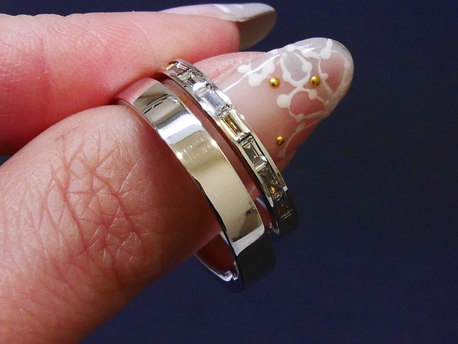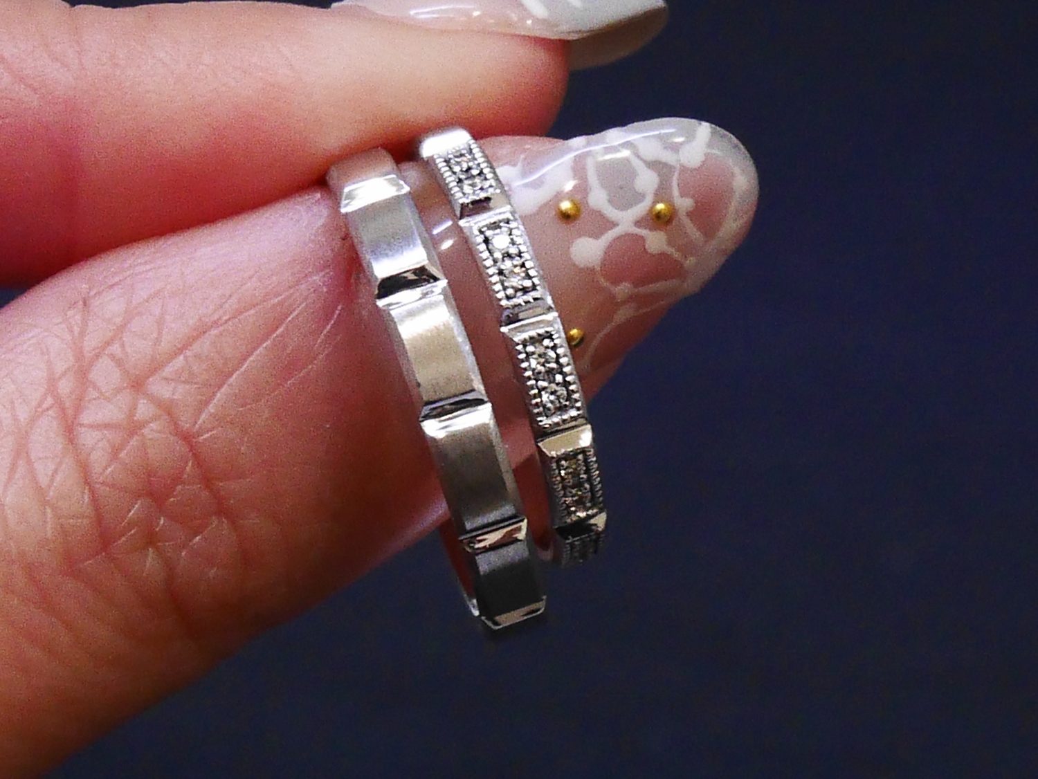 女性用は、ラウンドとバケットカットのダイヤモンドを組み合わせた他にないオシャレなデザインになっています。通常、ラウンド型のダイヤモンドが並びますが、バケットカットのダイヤモンドを挟むことでキラキラが強すぎず、気軽に着けていただけるのではないでしょうか。