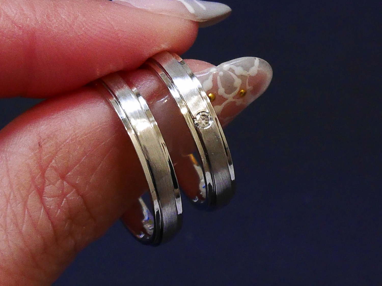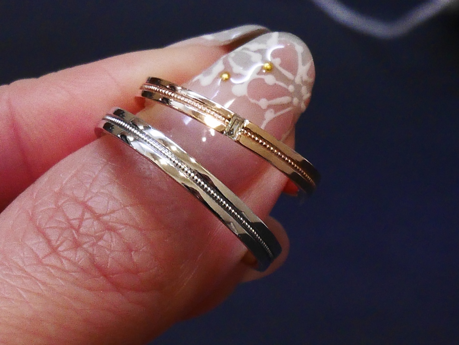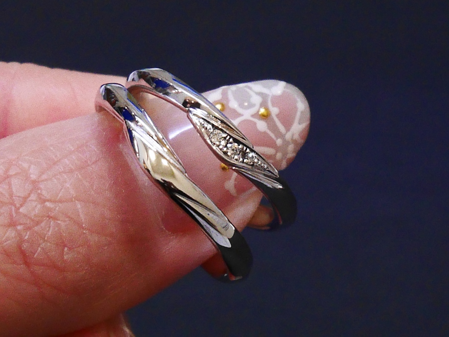 女性用の指輪にはバケットカットのダイヤモンドが施され、中央にミル打ち、シンプルだけどこだわりがあるクラシカルなデザインになっています。