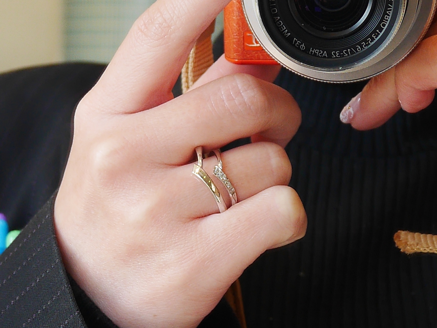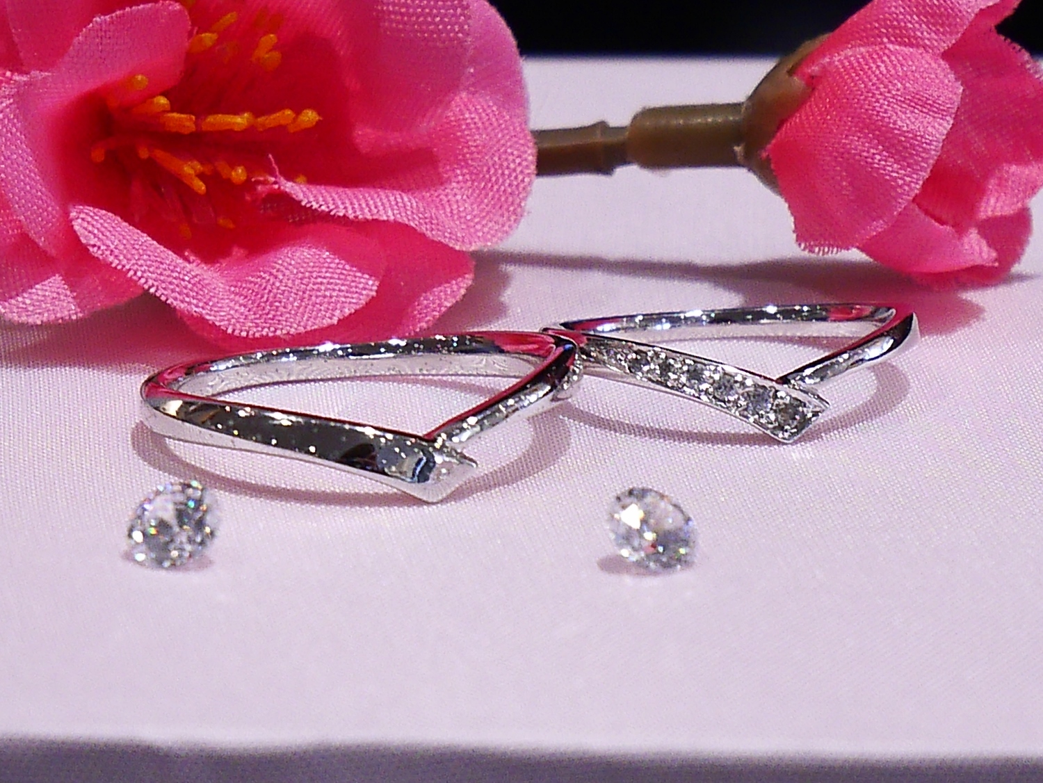 V字を描いたラインは、指を長く細く見せてくれます。片側だけに施されたダイヤモンドがキラッと輝き、上品さを感じさせるデザインです。